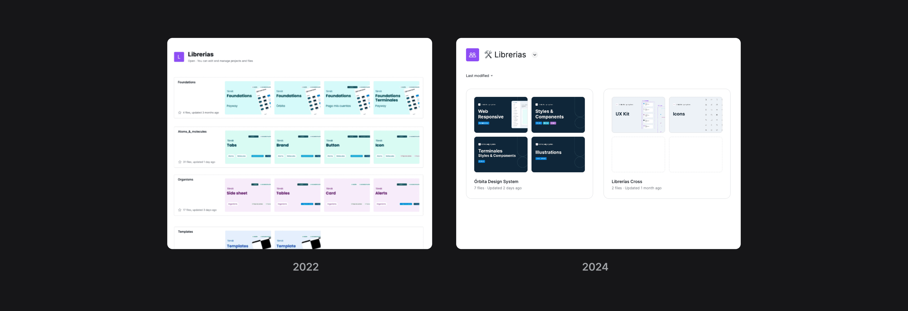 Once I tested Figma's variable functionality, Órbita transitioned from having different libraries per product (using the Swap Library function to switch between foundations) to having a centralized styles and components library with more than one mode for each product used.Inclusion of design patterns - 2023